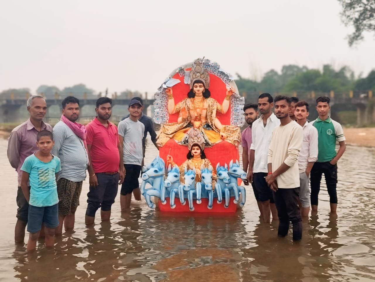 उत्साहित युवाओं ने श्रद्धापूर्वक प्रतिमाओं को मलिया नदी घाट तक पहुंचाया और सामूहिक रूप से विसर्जन संपन्न कराया।