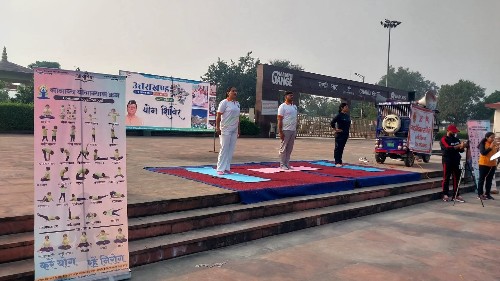 उत्तराखंड राज्य स्थापना दिवस के 25 वर्ष पूर्ण होने के उपलक्ष में रजत जयंती उत्सव कार्यक्रम में आज नमामि गंगे घाट चंडीघाट पर आयुष एवं आयुष शिक्षा विभाग उत्तराखंड के द्वारा आयुर्वेदिक यूनानी और होम्योपैथी विभाग के संयुक्त तत्वधान में योग अभ्यास किया गया जिसमें मुख्य अतिथि स्वामी अनंतानंद जी महाराज एवं विशिष्ट अतिथि योगी रजनीश जी अध्यक्ष ओम आरोग्यम योग मंदिर हरिद्वार संयुक्त रूप से किया गया।