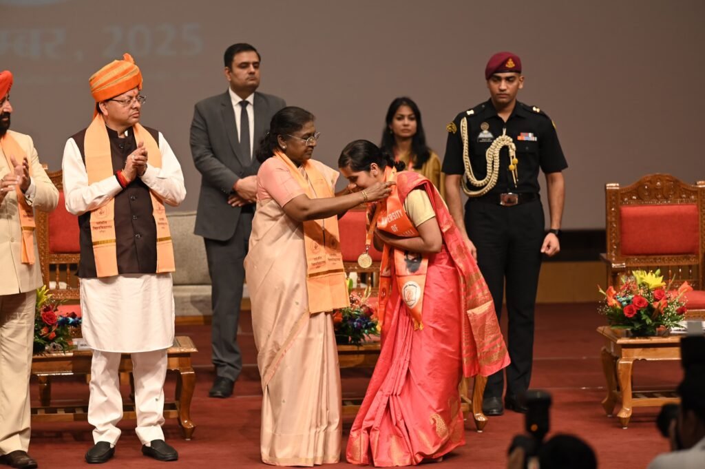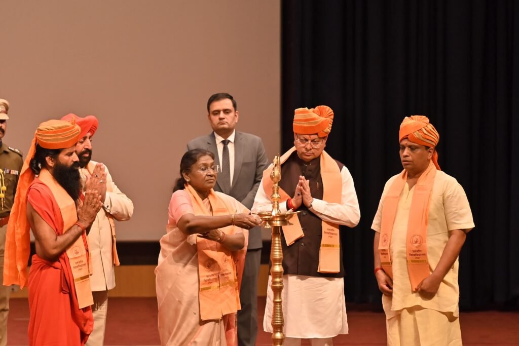 द्रौपदी मुर्मु ने पतंजलि विश्वविद्यालय हरिद्वार के द्वितीय दीक्षांत समारोह में स्वर्ण पदक प्राप्त विद्यार्थियों को सम्मानित किया। रविवार को आयोजित इस कार्यक्रम में कुल 1454 विद्यार्थियों को उपाधि प्रदान की गई। 62 शोधार्थियों को विद्या वारिधि और 3 शोधार्थियों को विद्या वाचस्पति की उपाधि प्रदान की गई, जबकि 615 विद्यार्थियों को परास्नातक और 774 विद्यार्थियों को स्नातक की उपाधि प्रदान की गई। इस अवसर पर राज्यपाल ले.ज.(से.नि.) गुरमीत सिंह ने राष्ट्रपति को राष्ट्रपति भवन की विविध वनस्पतियों पर आधारित दो पुस्तकें ‘फ्लोरा ऑफ राष्ट्रपति भवन’ एवं ‘मेडिसिनल प्लांट्स ऑफ राष्ट्रपति भवन’ की प्रतिलिपियाँ भेंट कीं।