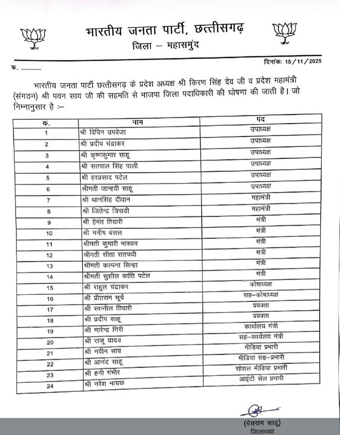 भारतीय जनता पार्टी छत्तीसगढ के प्रदेश अध्यक्ष श्री किरण सिंह देव जी व प्रदेश महामंत्री ( संगठन) श्री पवन साय जी की सहमति से भाजपा जिला पदाधिकारियों की घोषणा की गई है।