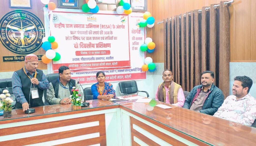बरेली। उपनिदेशक पंचायत के दिशा निर्देशन में जनपद के विकासखंड फतेहगंज पश्चिमी, मीरगंज, शेरगढ़, बहेड़ी और दमखोदा से चयनित पांच पांच ग्राम पंचायत के ग्राम प्रधान एवं सचिव का दो दिवसीय अनावासीय आय के सृजन पर ग्राम पंचायत भरतौल के लर्निंग सेन्टर के सभागार एक में प्रशिक्षण संपन्न हुआ। जिसमें प्रधान एवं सचिव को प्रशिक्षण देते हुए द्वितीय दिवस का शुभारंभ राज्य प्रशिक्षक अमित कुमार सिंह तोमर ने प्रार्थना से किया। प्रथम दिवस के आयोजित सत्रों के पुनरावलोकन पर चर्चा करते हुए राज्य प्रशिक्षक अमित कुमार सिंह तोमर ने पीपीटी और चर्चा के माध्यम से कामन सर्विस सेंटर में सेवा शुल्क से आय पर चर्चा कर कहा कि पारदर्शिता सहित स्थानीय सुविधाएं जितनी अच्छी होगी उतने ही अधिक लाभार्थी जुड़ेंगे और राजस्व बढ़ेगा। उन्होंने कहा कि पंचायत में आधार सेवा की बेहतर सुविधा हो तो स्वयं की आय में बढ़ोतरी होगी ही साथ ही साथ स्थानीय ग्रामीणों को आर्थिक बचत के साथ-साथ समय की बचत होगी और मानसिक परेशानी से भी बचे रहेंगे। ग्राम पंचायत की आय के अतिरिक्त साधन पर चर्चा करते हुए सर्विस डिलीवरी का सुदृढ़ीकरण पर जोर दिया। राज्य प्रशिक्षक अमित कुमार सिंह तोमर, दीक्षा और सोहेब ने बैंकिंग कॉरेस्पोंडेंस, मॉडल बैंक के प्रोडक्ट के बारे में चर्चा की। ओएसआर एवं जीपीडीपी पर चर्चा करते हुए ग्राम पंचायत में आय अर्जित करने पर जोर दिया। ओएसआर पोर्टल से संबंधित चर्चा करते हुए जानकारी दी। तृतीय बैच के समापन सत्र पर राज्य प्रशिक्षक अमित कुमार सिंह तोमर आदि ने ट्रेनिंग मैनेजमेंट पोर्टल पर प्रतिभागियों से क़्युज प्रतियोगिता, फीडबैक के उपरांत आनलाइन प्रमाण पत्र का वितरण कर संदेश दिया। इस दौरान प्रधान कड़े राम, पंचायत सचिव अमित कुमार, सुनील कुमार, मनोज पटेल आदि ने प्रशिक्षण में प्रतिभाग किया। प्रशिक्षण में वर्तमान प्रधान श्रीमती प्रवेश, पूर्व प्रधान रीत राम, मंडलीय परियोजना प्रबंधक सचिन देव, स्वच्छ भारत मिशन के मंडलीय सलाहकार राजपाल सिंह, पंचायत सहायक निशा पाल आदि का विशेष सहयोग रहा।