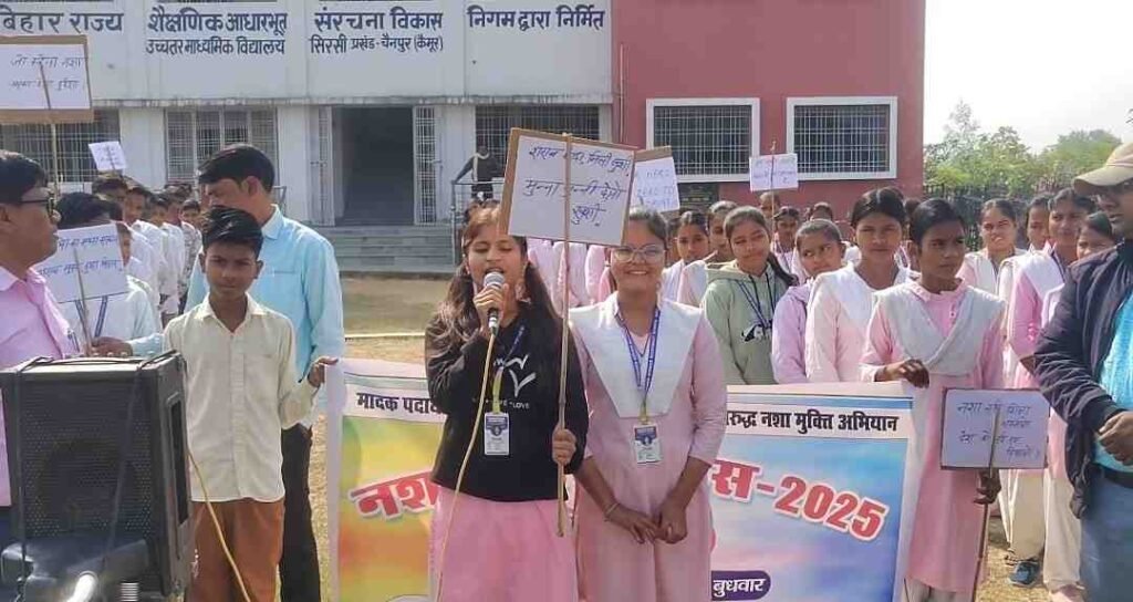 नशा मुक्ति दिवस के अवसर पर चैनपुर प्रखंड अंतर्गत उच्चतर माध्यमिक विद्यालय सिरसी में बुधवार को एक भव्य जन-जागरूकता रैली का आयोजन किया गया। विद्यालय प्रशासन द्वारा संचालित इस कार्यक्रम में प्रधानाध्यापक बाबूलाल राम सहित सभी शिक्षक और सैकड़ों की संख्या में छात्र-छात्राएँ उत्साहपूर्वक शामिल हुए।