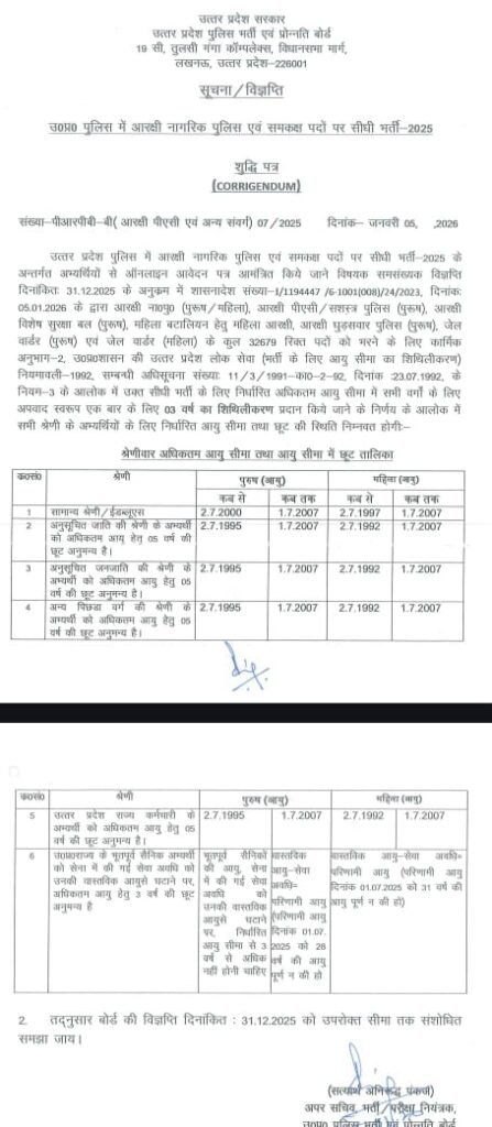 लखनऊ।आज मुख्यमंत्री उत्तर प्रदेश योगी आदित्यनाथ जी द्वारा अभ्यर्थीयो के हितों को ध्यान में रखते हुए सम्यक विचारों के उपरांत उत्तर प्रदेश पुलिस में आरक्षी नागरिक पुलिस एवं समकक्ष भर्ती 2025 के अन्तर्गत आनलाईन आवेदन पत्र आमंत्रित किए जाने विषयक समसंख्यक विज्ञप्ति दिनांकित 31-12-2025 के अनुक्रम में शासनादेश संख्या -1/114447/6-1001(008)24/23, दिनांक 05-01-2026 के द्वारा आरक्षी ना0पु0 (पुरुष/महिला) आरक्षी पीएसी /सशस्त्र पुलिस (पुरुष) आरक्षी विशेष सुरक्षा बल (पुरुष) महिला बटालियन हेतु (महिला) आरक्षी, आरक्षी घुड़सवार पुलिस, पुरुष जेल वार्डर (पुरुष )एवं जेल वार्डर (महिला) कुल 32679 रिक्त पदों को भरने हेतु कार्मिक अनुभाग -2 उत्तर प्रदेश शासन की उत्तर प्रदेश लोक सेवा की (भर्ती के लिए आयु सीमा का शिथलीकरण) नियमावली – 1992 संबंधी अधिसूचना संख्या 11/3/1991-का-02-92 दिनांक 23.7 1992 नियम -3 के आलोक में उक्त सीधी भर्ती के लिए निर्धारित अधिकतम आयु सीमा मे सभी वर्गों के लिए अपवाद स्वरूप एक बार के लिए 03 बर्ष का शिथलीकारण प्रदान किए जाने का निर्णय लिया गया है ।