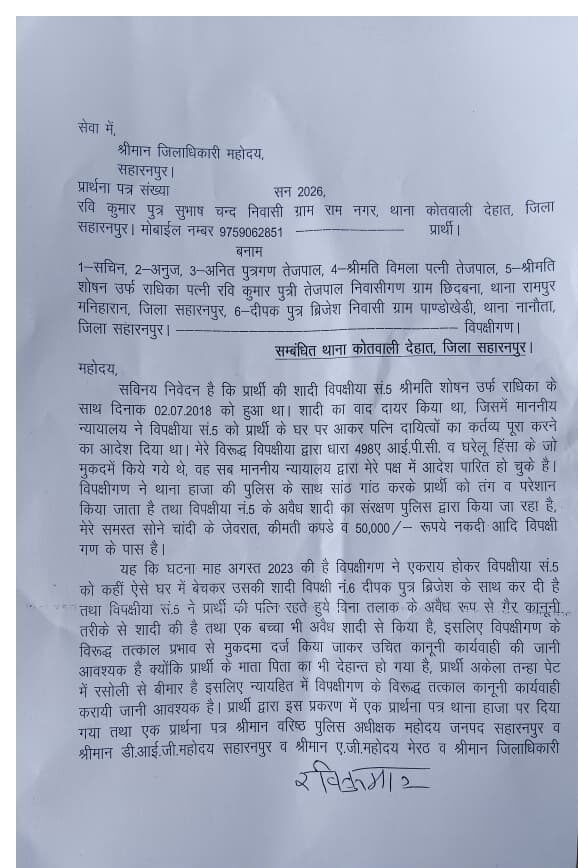 सहारनपुर। जनपद सहारनपुर से एक ऐसा मामला सामने आया है जिसने न सिर्फ पारिवारिक कानून, बल्कि पुलिस की कार्यप्रणाली और निष्पक्षता पर भी गंभीर प्रश्नचिह्न खड़े कर दिए हैं। ग्राम रामनगर, थाना कोतवाली देहात निवासी रवि कुमार पुत्र सुभाष चन्द ने जिलाधिकारी को दिए गए विस्तृत प्रार्थना पत्र में आरोप लगाया है कि उनकी पत्नी शोषन उर्फ राधिका ने बिना तलाक अवैध रूप से दूसरी शादी कर ली, जबकि वह आज भी कानूनन प्रार्थी की पत्नी है। रवि कुमार के अनुसार उनकी शादी दिनांक 02 जुलाई 2018 को हुई थी, लेकिन बाद में पारिवारिक विवाद उत्पन्न होने पर मामला न्यायालय तक पहुंचा, जहां माननीय न्यायालय ने विपक्षीया को प्रार्थी के घर आकर पत्नी धर्म निभाने का आदेश दिया था।