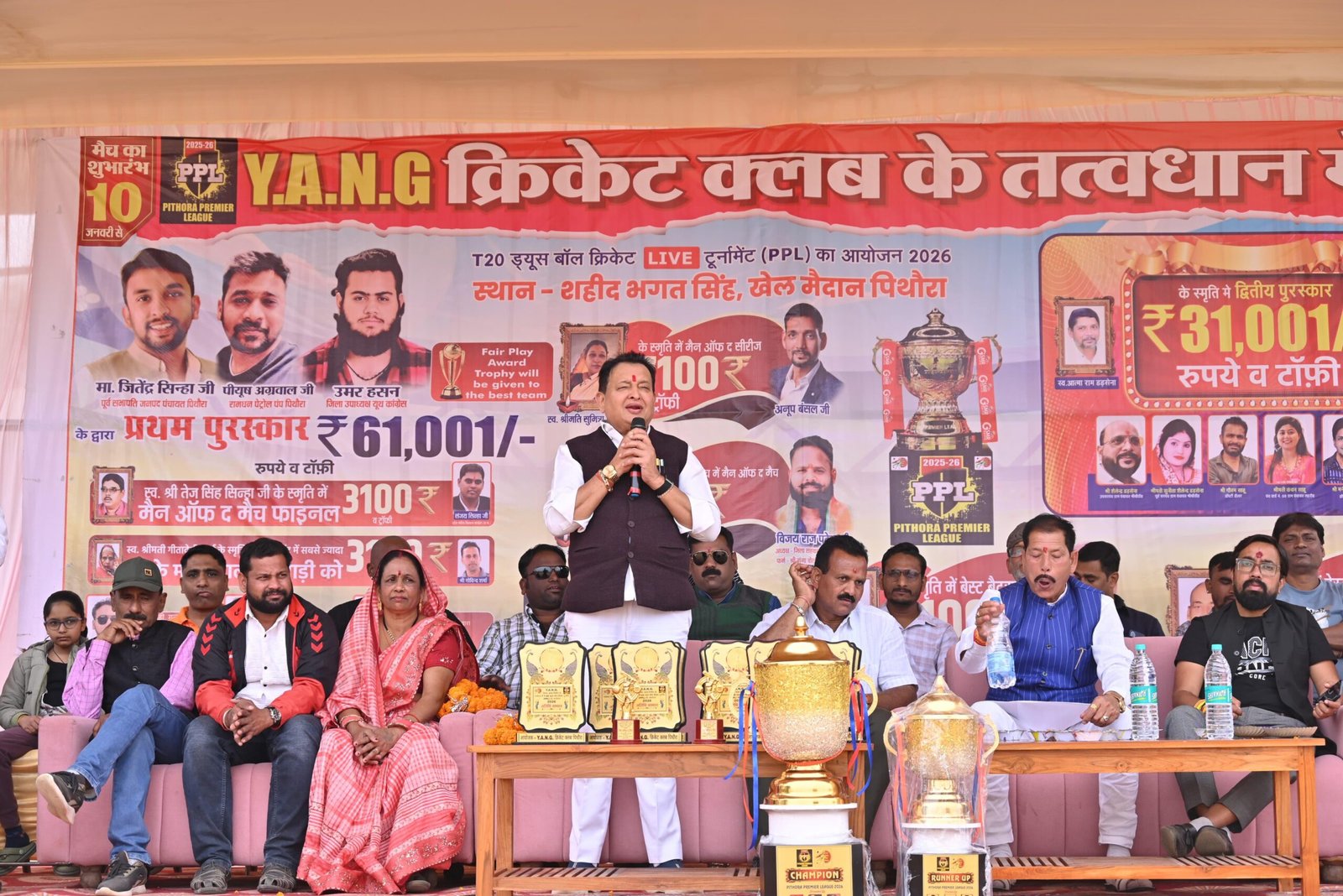 पिथौरा- यंग क्रिकेट क्लब द्वारा सहीद भगत सिंह खेल मैदान में आयोजित T 20 डियूज़ बाल क्रिकेट प्रतियोगिता का शुभारंभ कार्यक्रम बसना विधायक डा संपत अग्रवाल के मुख्य आतिथ्य में संपन्न हुवा। कार्यक्रम की अध्यक्षता कर रहे नगर पंचायत अध्यक्ष देवेश निषाद विशेष अतिथि नगर पंचायत उपाध्यक्ष वीरेंद्र तिवारी,भाजपा जिला प्रवक्ता स्वप्निल तिवारी पूर्व मंडल अध्यक्ष नरेश सिंघल पार्षद मन्नूलाल ठाकुर विधायक प्रतिनिधि अनूप अग्रवाल सुरेंद्र पांडे पार्षद संतोष डडसेना रामकुंवर सिंहा भीमा रौतिया संदीप सेन कौशल मानिकपुरी पुष्पकांत पटेल ने खिलाड़ियो का परिचय प्राप्त कर मैच का शुभारंभ कराया।कार्यक्रम की सुरुवात बेहद आध्यात्मिक और गरिमामयी ढंग से हुई कार्यक्रम के मुख्य अतिथि विधायक संपत अग्रवाल ने चैंपियन ट्राफी का अनावरण कर खिलाड़ियो से परिचय प्राप्त किया।