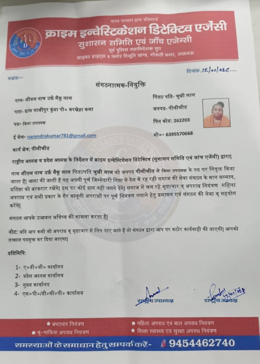 पीलीभीत। सामाजिक सुधार और अपराध नियंत्रण की दिशा में कार्य करने वाली संस्था ‘क्राइम इन्वेस्टिगेशन डिटेक्टिव’ (सुशासन समिति एवं जाँच एजेंसी) ने उत्तर प्रदेश के पीलीभीत जिले में अपनी नई संगठनात्मक नियुक्ति की घोषणा की है। संस्था के राष्ट्रीय एवं प्रदेश अध्यक्ष के निर्देशन पर शीतल नाथ उर्फ मैकू लाल को तत्काल प्रभाव से जिला उपाध्यक्ष के पद पर नियुक्त किया गया है।