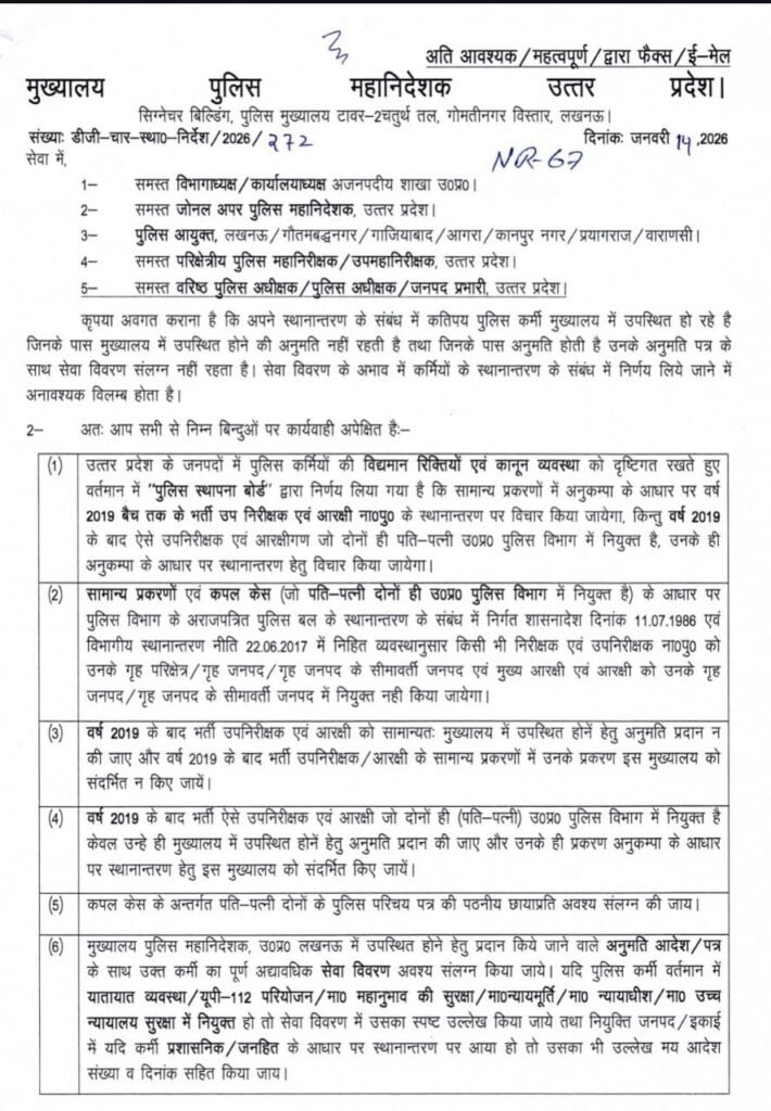 लखनऊ। उत्तर प्रदेश पुलिस की ट्रांसफर नीति में बड़ा और सख्त बदलाव किया गया है। *वर्ष 2019 बैच तक भर्ती दरोगा और सिपाहियों के सामान्य मामलों में अब अनुकंपा के आधार पर ही ट्रांसफर पर विचार होगा*