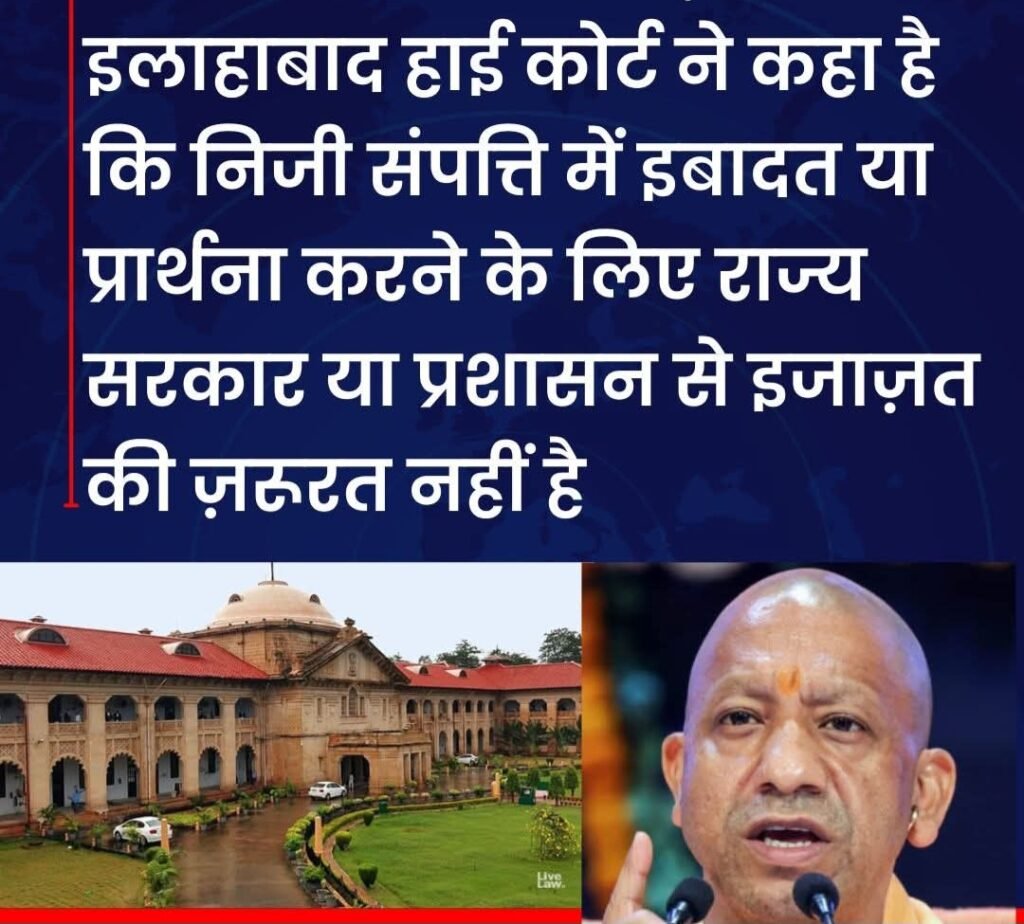 इलाहाबाद हाई कोर्ट ने स्पष्ट किया है कि निजी संपत्ति (private property) के अंदर धार्मिक इबादत या प्रार्थना सभा आयोजित करने के लिए राज्य सरकार या प्रशासन से किसी पूर्व अनुमति की आवश्यकता नहीं है, क्योंकि यह अनुच्छेद 25 के तहत मौलिक अधिकार है। हालांकि, यदि सभा के कारण सार्वजनिक रास्ते बाधित होते हैं या भीड़ बाहर आती है, तो पुलिस को सूचित करना और अनुमति लेना आवश्यक होगा।