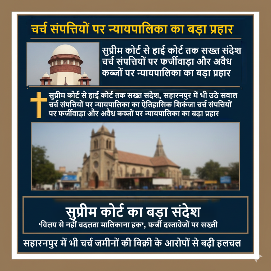 चर्च संपत्तियों पर न्यायपालिका का ऐतिहासिक शिकंजा: सुप्रीम कोर्ट का बड़ा संदेश—‘विलय से नहीं बदलता मालिकाना हक’, फर्जी दस्तावेजों पर सख्ती; सहारनपुर में भी चर्च जमीनों की बिक्री के आरोपों से बढ़ी हलचल