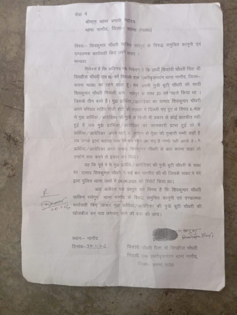 सतना/नागोद-फरियादी किशोरी चौधरी पिता सिपहिया चौधरी उम्र 60 वर्ष निवासी उमरी ब्रिज थाना नागोद जिला सतना ने आप बीती सुनाते हुए बताया कि मेरी बेटी बूटी का विवाह शिवकुमार चौधरी निवासी राधेपुर के साथ 20 वर्ष पहले हुआ था मेरी बेटी के 3 बच्चे है,मेरा दामाद शिवकुमार मिस्त्री का काम करता है और मेरी बेटी और बच्चों को लेकर बाहर कमाने गया था ,विगत 6 महीने से हमारी बेटी का पता नही है जबकि दामाद और बच्चे गांव आ गए थे ,मेरी बेटी और नाती बताते थे कि दामाद हमारे साथ बहुत मारपीट करता है,मुझे शंका है कि मेरे दामाद ने ही मेरी बेटी की हत्या कर दी है।उक्ताशय की लिखित शिकायत थाने में दर्ज करवाई गई है।
