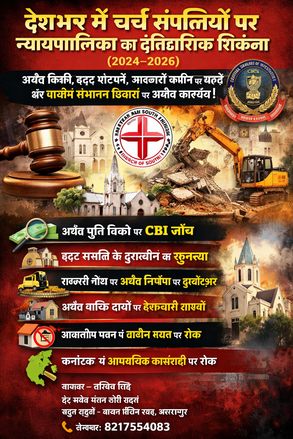 🚨 देशभर में चर्च संपत्तियों पर न्यायपालिका का ऐतिहासिक शिकंजा (2024–2026) — अवैध बिक्री, ट्रस्ट घोटाले, सरकारी ज़मीन पर कब्ज़े और प्रार्थना सभागार विवादों पर हाईकोर्ट से लेकर सीबीआई तक सख़्त कार्रवाई 🚨
