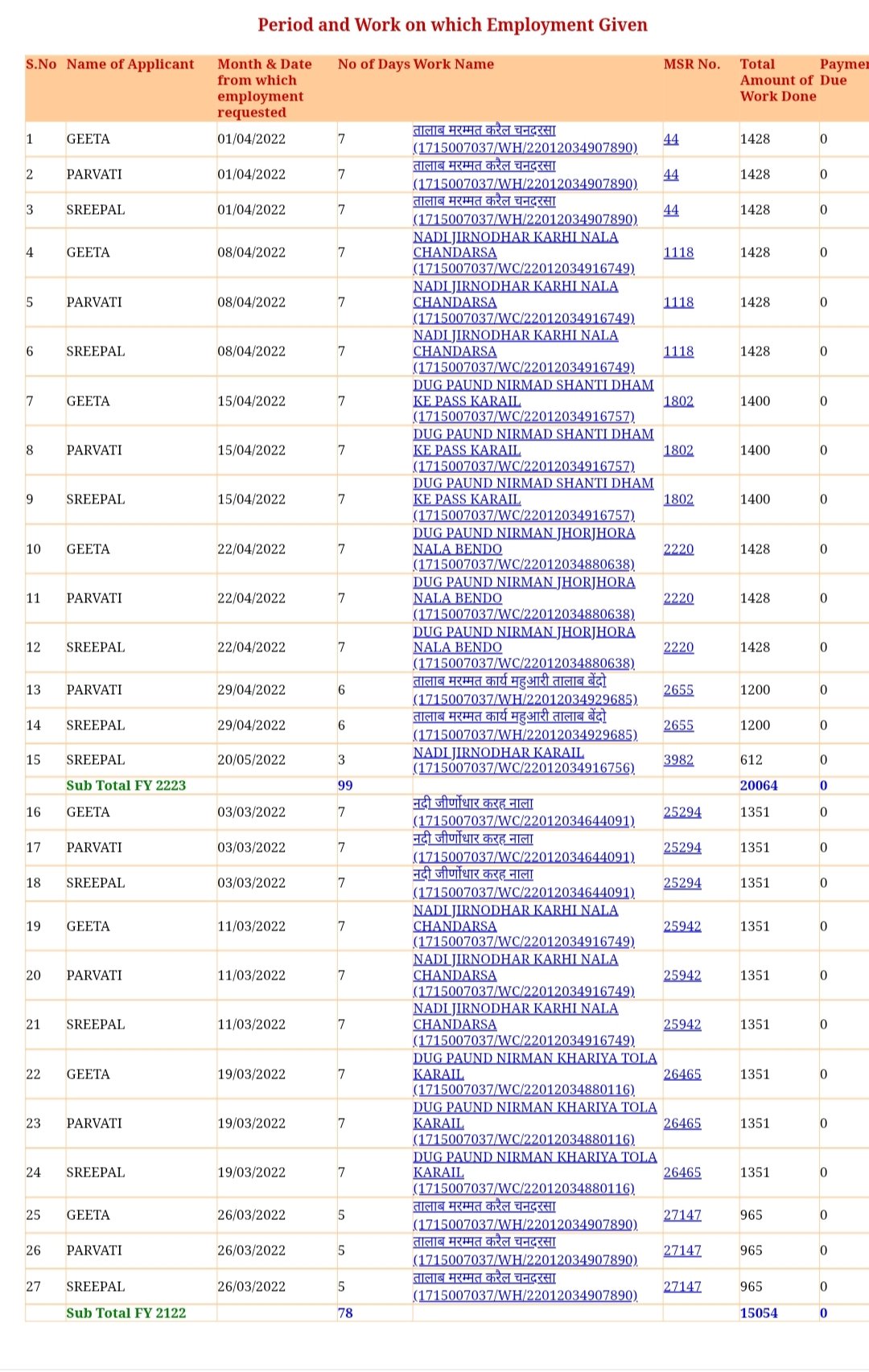 अब हुनरमंद रोजगार सहायक का कमाल देखिए पहले जॉब कार्ड में श्रीपाल को 13 अप्रैल 2021 से 19 अप्रैल 2021 तक मांग संख्या 1197 63 मस्टर रोल क्रमांक 583 में आरसीसी नाली निर्माण प्राथमिक शाला से धर्मी सिंह के घर तक बेदो मैं काम करना लेख किया गया है और इसी समय श्रीपाल तीसरी जॉब कार्ड में 13 अप्रैल 2021 से 19 अप्रैल 2021 तक ही मांग संख्या 119797 में मास्टर रोल क्रमांक 584 में इस काम यानी आईसीसी नाल निर्माण प्राथमिक शाला से धर्मी सिंह के घर तक बेदो मैं काम कर रहे हैं है ना गजब का हुनर कि एक आदमी को दो आदमी बता कर काम कराया जा रहा है