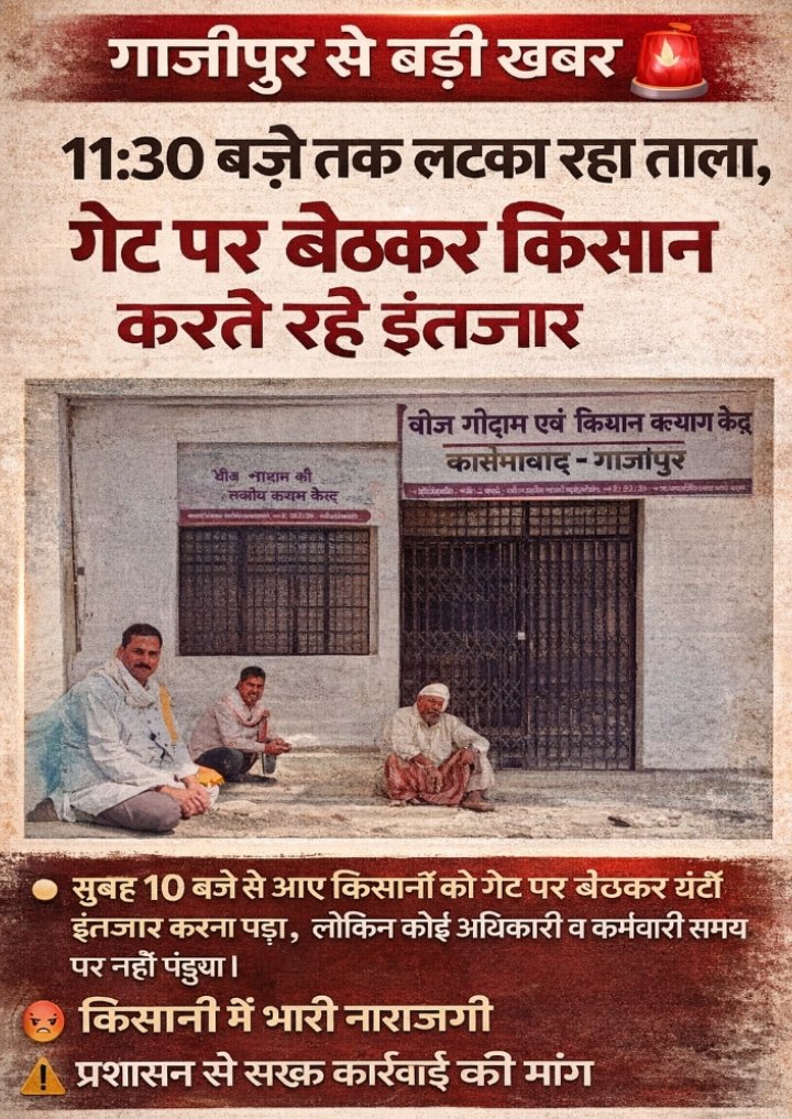 गाजीपुर। जनपद के कासिमाबाद विकासखंड स्थित बीज गोदाम एवं किसान कल्याण केंद्र पर सोमवार को भारी अव्यवस्था देखने को मिली। केंद्र का ताला सुबह 11:30 बजे तक नहीं खुला, जिससे दूर-दराज से आए किसानों को कई घंटों तक गेट पर बैठकर इंतजार करना पड़ा। इससे किसानों में भारी आक्रोश देखा गया।