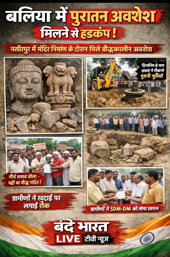 बलिया जिले के रसड़ा तहसील अंतर्गत नसीरपुर ग्राम सभा में शिवलिंग के नीचे मंदिर निर्माण के लिए जेसीबी से की जा रही खुदाई के दौरान बौद्ध काल और सम्राट अशोक के समय से जुड़े कुछ प्राचीन अवशेष मिलने का दावा किया गया है। इस खोज के बाद पूरे गांव में हड़कंप मच गया और ग्रामीणों ने तत्काल खुदाई कार्य पर रोक लगा दी।