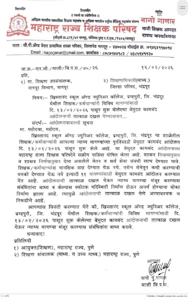 ख्रिस्तानंद विद्यालय ब्रह्मपुरी के शिक्षक एवं गैर-शिक्षण कर्मचारी न्याय की मांग को लेकर 13 फरवरी 2026 से विद्यालय के सामने विरोध प्रदर्शन कर रहे हैं। ख्रिस्तानंद विद्यालय का संस्था प्रबंधन शिक्षकों एवं गैर-शिक्षण कर्मचारियों को विद्यालय के नियमानुसार नियमित वेतन, महंगाई भत्ता, भविष्य निधि कटौती, चिकित्सा अवकाश, ग्रेच्युटी एवं कार्य के घंटे न देने के कारण काफी मानसिक दबाव में काम कर रहा है तथा समय-समय पर शिक्षकों एवं गैर-शिक्षण कर्मचारियों को नौकरी से निकालने की धमकी देता आ रहा है। इस अन्याय को देखते हुए सभी शिक्षक एवं गैर-शिक्षण कर्मचारी एक साथ आकर न्याय की मांग को लेकर विरोध प्रदर्शन कर रहे हैं। उपरोक्त विरोध का संज्ञान लेते हुए महाराष्ट्र राज्य शिक्षक परिषद के पूर्व शिक्षक विधायक माननीय नागो गाणार सर एवं ब्रह्मपुरी विधान सभा के पूर्व विधायक माननीय अतुलजी देशकर और महाराष्ट्र स्टेट टीचर्स काउंसिल के कॉन्वेंट डिपार्टमेंट हेड विवेक आंबेकर ने माननीय डिप्टी डायरेक्टर ऑफ़ एजुकेशन, नागपुर और माननीय एजुकेशन ऑफिसर, चंद्रपुर डिस्ट्रिक्ट को भूख हड़ताल पर बैठे टीचर्स की जांच करने और उन्हें इंसाफ दिलाने के लिए एक रिप्रेजेंटेशन दिया है।
