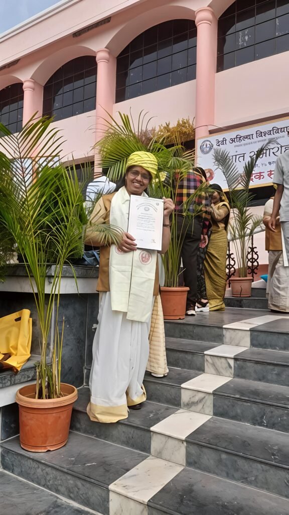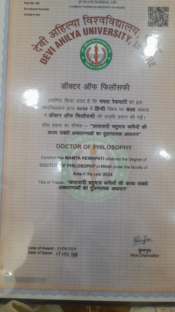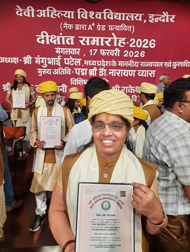 श्रीमती ममता रेव पार्टी के सफलतम शोध कार्य पर विश्वविद्यालय द्वारा आयोजित दीक्षांत समारोह में महामही एम राज्यपाल श्री मंगू भाई पटेल द्वारा डॉक्टर ऑफ फिलॉसफी की सनत प्रदान की गई।