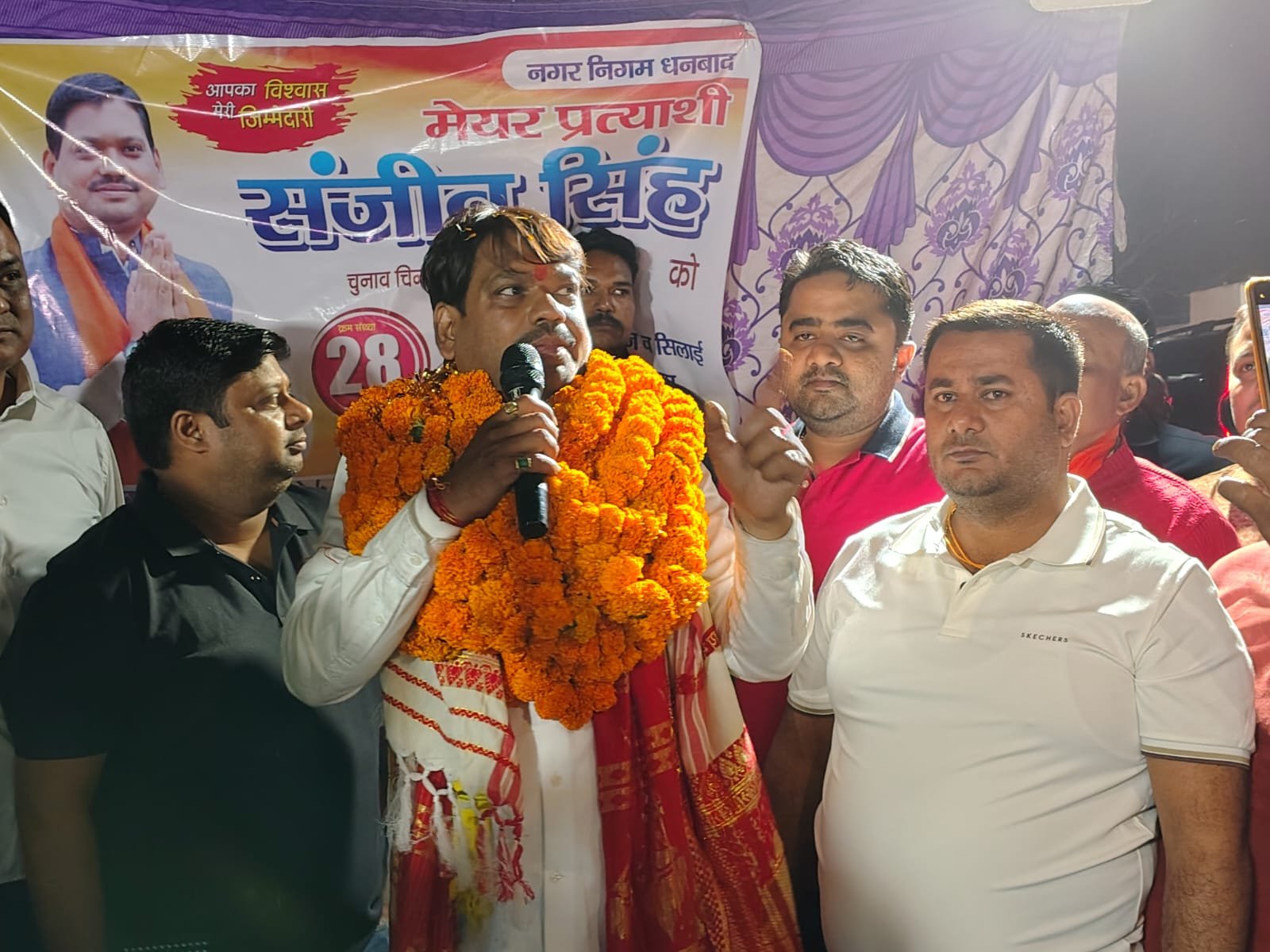 धनबाद/सिजुआ:- सिजुआ 10 नंबर मोड़ मे 18 फरवरी 2026 बोधवार को धनबाद नगर निगम के मेयर प्रत्याशी संजीव सिंह का व्यापक जनसंपर्क एवं स्वागत कार्यक्रम आयोजित किया गया। आयोजित सभा के दौरान समाजसेवी प्रकाश सिंह सहित स्थानीय समर्थकों ने संजीव सिंह का माल्यार्पण करते हुए भव्य स्वागत किया। कार्यक्रम में बड़ी संख्या में गणमान्य नागरिक, समर्थक एवं क्षेत्रवासी उपस्थित रहे।