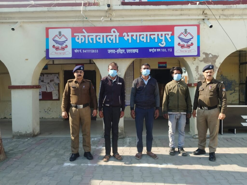 उपरोक्त क्रम में भगवानपुर पुलिस टीम द्वारा कार्रवाई करते हुए मा० न्यायालय से वांछित चल रहे वारण्टी 01.सोनू कुमार पुत्र अशोक कुमार निवासी ग्राम किशनपुर जमालपुर थाना भगवानपुर हरिद्वार 02. प्रवेश सैनी पुत्र हुकम सिंह निवासी ग्राम इब्राहिमपुर मसाई थाना भगवानपुर जनपद हरिद्वार 03. बन्टी कुमार पुत्र सुभाष कुमार निवासी ग्राम डाडाजलालपुर थाना भगवानपुर जनपद हरिद्वार को दिनांक-19.02.2026 रात्रि में उसके मस्कन पर दबिश देकर धर दबोचा।