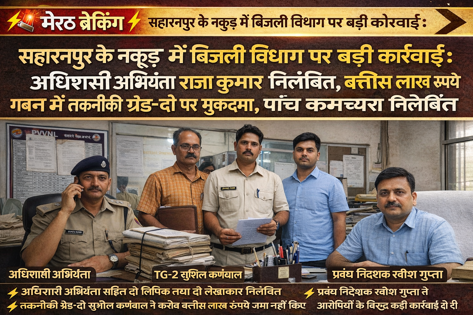 ⚡🚨 सहारनपुर ब्रेकिंग | सहारनपुर के नकुड़ में बिजली विभाग पर बड़ी कार्रवाई: अधिशासी अभियंता राजा कुमार निलंबित, बत्तीस लाख रुपये गबन में तकनीकी ग्रेड-दो पर मुकदमा, पाँच कर्मचारी निलंबित 🚨⚡