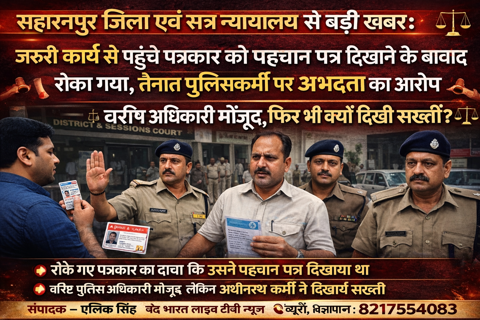 🚨⚖️ सहारनपुर जिला एवं सत्र न्यायालय से बड़ी खबर: जरूरी कार्य से पहुंचे पत्रकार को पहचान पत्र दिखाने के बावजूद रोका गया, तैनात पुलिसकर्मी पर अभद्रता का आरोप — वरिष्ठ अधिकारी मौजूद, फिर भी क्यों दिखी सख्ती? ⚖️🚨