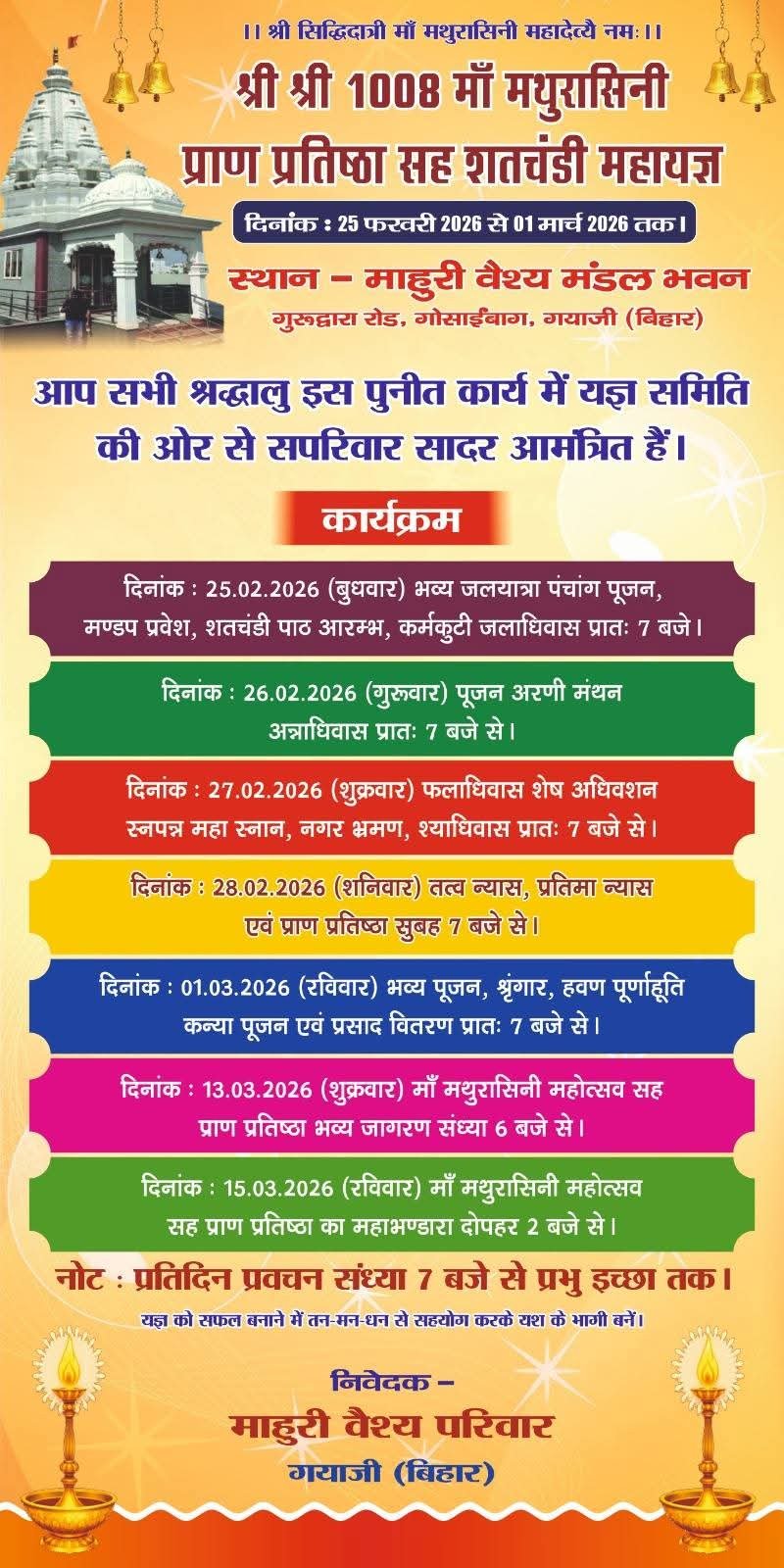 गया जी। माहुरी वैश्य मंडल, गोसाईबाग, गया जी के तत्वावधान में श्री श्री 1008 माँ मथुरासिनी प्राण-प्रतिष्ठा सह शतचंडी महायज्ञ का शुभारंभ दिनांक 25 फरवरी 2026 (बुधवार) से भव्य रूप से होने जा रहा है, जो 01 मार्च 2026 (रविवार) तक पाँच दिवसीय आध्यात्मिक अनुष्ठान के रूप में संपन्न होगा। इस पावन अवसर पर धार्मिक, आध्यात्मिक एवं सांस्कृतिक कार्यक्रमों की विस्तृत श्रृंखला आयोजित की जाएगी, जिसमें शहर एवं आसपास के धर्मप्रेमी श्रद्धालुओं से अधिक से अधिक संख्या में उपस्थित होकर आध्यात्मिक वातावरण का लाभ उठाने तथा पुण्य के भागी बनने का आग्रह किया गया है।