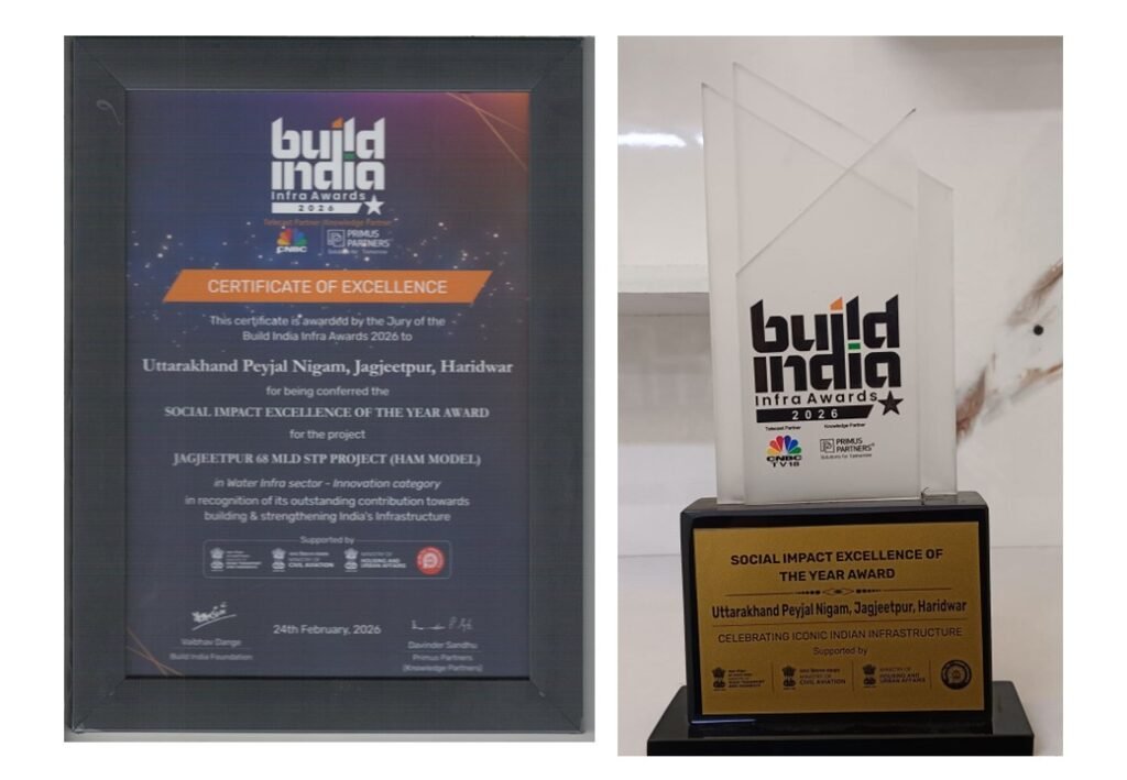 उत्तराखण्ड पेयजल निगम हरिद्वार को जगजीतपुर 68 एमएलडी सीवेज शोधन संयंत्र (STP) परियोजना (HAM मॉडल) के लिए बिल्ड इंडिया इंफ्रा अवार्ड्स में “सोशल इम्पैक्ट एक्सीलेंस ऑफ द ईयर अवार्ड” से सम्मानित किया गया है। यह सम्मान केंद्रीय जल शक्ति मंत्री सी.आर. पाटिल द्वारा प्रदान किया गया। राज्य की ओर से यह सम्मान मीनाक्षी मित्तल, परियोजना प्रबन्धक निमार्ण एवं अनुरक्षण इकाई (गंगा), उत्तराखण्ड पेयजल निगम हरिद्वार द्वारा प्राप्त किया गया।