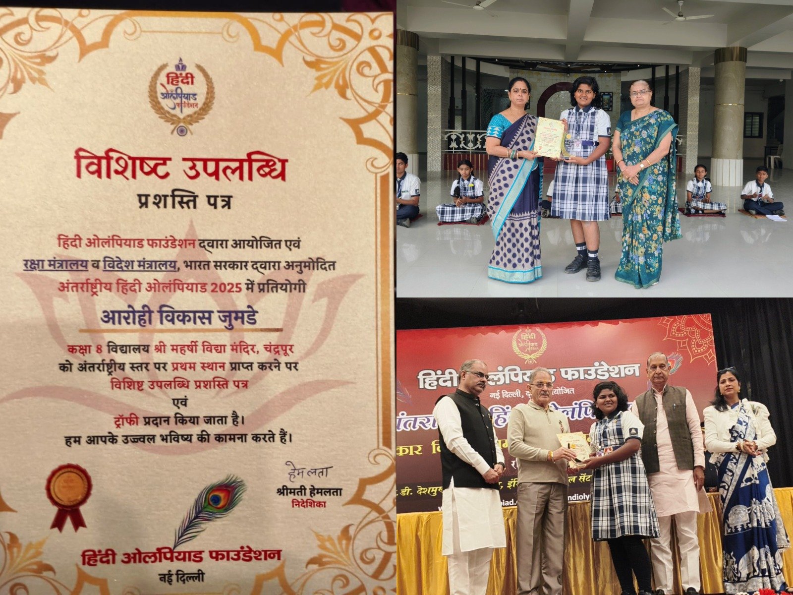 चंद्रपूर : श्री महर्षि विद्या मंदिरातील विद्यार्थ्यांनी आता आंतरराष्ट्रीय स्तरावर शाळेचे नाव उंचावले आहे. हिंदी ऑलिंपियाड फाउंडेशन नवी दिल्ली यांनी आयोजित केलेल्या आणि भारत सरकारच्या संरक्षण मंत्रालय आणि परराष्ट्र मंत्रालयाने मान्यता दिलेल्या आंतरराष्ट्रीय हिंदी ऑलिंपियाड २०२५ मध्ये, श्री महर्षि विद्या मंदिरच्या आठवीच्या इयत्तेतील विद्यार्थी आरोही विकास जुमडेने प्रथम क्रमांक पटकावला आणि सातवीच्या गणेश सुभाष भुसारीने नववा क्रमांक पटकाविला. या महान कामगिरीसाठी, २२ फेब्रुवारी २०२६ रोजी नवी दिल्ली येथे झालेल्या केंद्रीय हिंदी ऑलिंपियाड-पुरस्कार वितरण समारंभात त्यांना सन्मानित करण्यात आले. ज्या अंतर्गत त्यांना सर्वोत्कृष्ट कामगिरीसाठी गुणवत्ता प्रमाणपत्र आणि ट्रॉफी देण्यात आली.सोबत आरोही जुमडे हिला ५१००/- ही रोख रक्कमही बक्षीस स्वरूप देण्यात आली. शाळेच्या मुख्याध्यापिका श्रीमती. श्रीलक्ष्मी मूर्ती मॅडम आणि उपमुख्याध्यापिका श्रीमती. निशा मेहता मॅडम यांनी या उल्लेखनीय कामगिरीबद्दल दोन्ही विद्यार्थ्यांचे मनापासून अभिनंदन केले. गुरुकुल शिक्षा संस्थेचे अध्यक्ष श्री. गिरीश चांडक सर, सचिव श्री. दत्तात्रेय कंचर्लावार सर आणि इतर सर्व सन्माननीय सदस्यांनी दोन्ही विद्यार्थ्यांचे अभिनंदन केले आणि त्यांना उज्ज्वल भविष्यासाठी शुभेच्छा दिल्या.