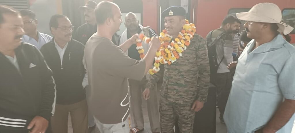 28 फरवरी 2026 (AN) को सेना से सेवानिवृत्त हुए नायक सुनील कुमार मिश्रा के स्वागत हेतु उनके पिता-माता, भाई-बहन, भाभियाँ, धर्मपत्नी, बच्चे एवं परिजन प्रातः से ही स्टेशन पर फूल-मालाएँ, चंदन तिलक, अक्षत, कलश, विविध उपहार, बैंड-बाजा और खुली जीप के साथ प्रतीक्षा कर रहे थे। जैसे ही ट्रेन प्लेटफॉर्म पर पहुँची, पूरा स्टेशन “भारत माता की जय” और “वंदे मातरम्” के नारों से गूंज उठा।
