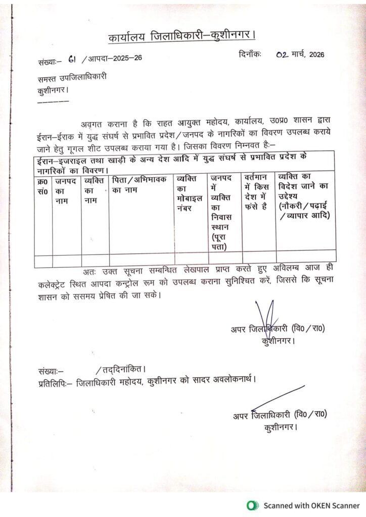 जिला अधिकारी कुशीनगर ने पत्र जारी कर विदेशों में गये लोगों के परिजनों हेतु सुचना जारी किया है और बताया है कि जिस किसी के परिजन,ईरान-इराक-सऊदी अरब में जारी युद्ध/तनाव के कारण जो भारतीय नागरिक वहां फंसे हैं, उनके परिजन तत्काल अपने संबंधित हल्का लेखपाल को व्यक्ति का नाम, पिता का नाम व पता, पासपोर्ट नंबर और संपर्क नंबर नोट कराएं।