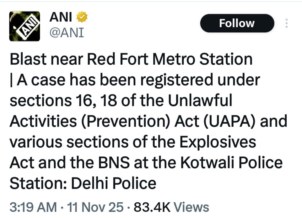 लाल किला मेट्रो स्टेशन के पास विस्फोट के संबंध में कोतवाली पुलिस स्टेशन में गैरकानूनी गतिविधियाँ (रोकथाम) अधिनियम (UAPA) की धारा 16, 18 और विस्फोटक अधिनियम और BNS की विभिन्न धाराओं के तहत मामला दर्ज किया गया है। दिल्ली पुलिस ने यह जानकारी दी है।