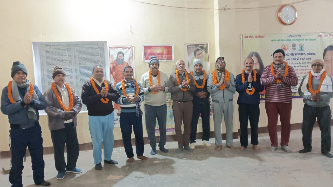 पतंजलि योग परिवार, रॉबर्ट्सगंज इकाई सोनभद्र के प्रमुख संरक्षक रमेश राम पाठक के निर्देशन व भारत स्वाभिमान नगर संरक्षक शेषमणी तिवारी की उपस्थिति में शुक्रवार को सोनभद्र बार सभागार सोनभद्र के नियमित योग साधकों का माल्यार्पण कर स्वागत सम्मान किया गया।