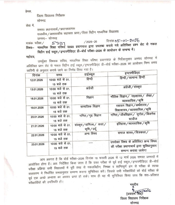 माध्यमिक शिक्षा परिषद प्रयागराज के निर्देशानुसार जनपद सोनभद्र में वर्ष 2025–26 के लिए हाईस्कूल एवं इंटरमीडिएट प्री-बोर्ड परीक्षा 2026 के आयोजन की समय-सारिणी जारी कर दी गई है। जिला विद्यालय निरीक्षक सोनभद्र द्वारा जारी आदेश के अनुसार यह परीक्षाएं अतिरिक्त प्रश्न सेट के माध्यम से कराई जाएंगी।